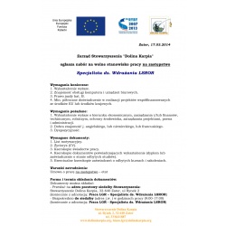 Zarząd Stowarzyszenia "Dolina Karpia" ogłasza nabór na wolne stanowisko pracy na zastępstwo Specjalista ds. Wdrażania LSRORWymagania konieczne: 1. Wykształcenie wyższe. 2. Znajomość obsługi komputera i urządzeń biurowych. 3. Prawo jazdy kat. B. ...