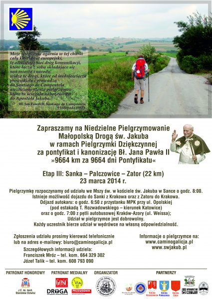 W najbliższą niedzielę (tj. 23 marca) pielgrzymi wyruszą na III etap pielgrzymki z Sanki do Zatora. Pielgrzymka rozpocznie się od Mszy św. odprawionej w kościele św. Jakuba w Sance o godz. 8:00.