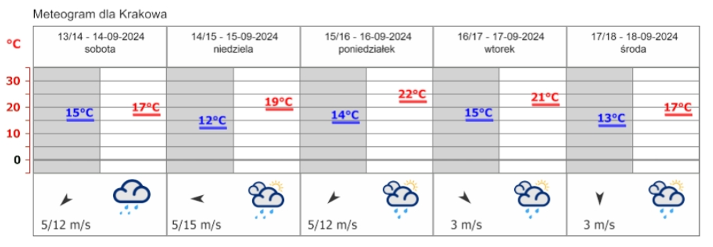 Zachmurzenie całkowite, w dzień na wschodzie przejaśnienia. Opady deszczu, miejscami o natężeniu silnym. Temperatura minimalna od 12°C na zachodzie do 16°C na północnym wschodzie, w rejonach podgórskich od 10°C do 12°C, na Podhalu miejscami około 8°C.