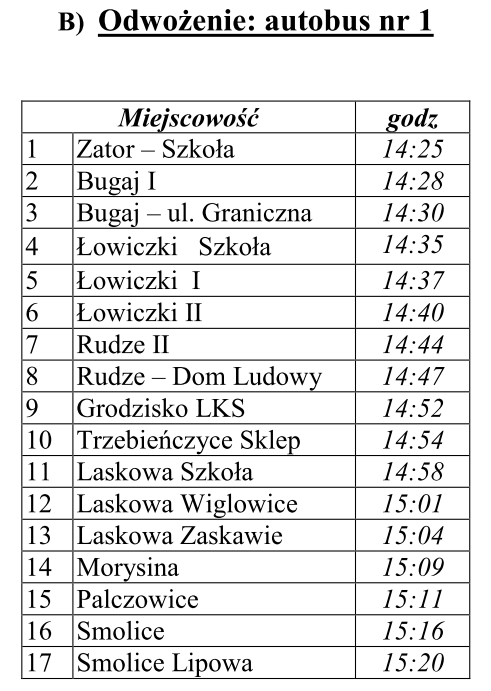 Z uwagi na zawieszenie zajęć stacjonarnych w klasach IV-VIII i przejście na tryb zdalny nauki po analizie obecnych kursów oraz zgłoszonych przez Dyrektorów Szkół list uczniów aktualnie korzystających z autobusu szkolnego od 2 listopada 2020 roku do odwołania zmianie ulega rozkład jazdy autobusu szkolnego następująco: