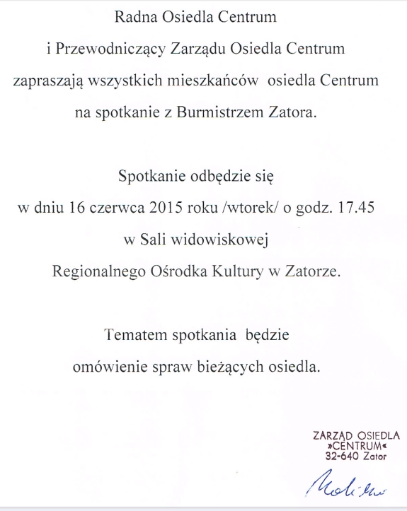 Ogłoszenie, zebranie mieszkańców osiedla Centrum z Burmistrzem Zatora 2015-06-10