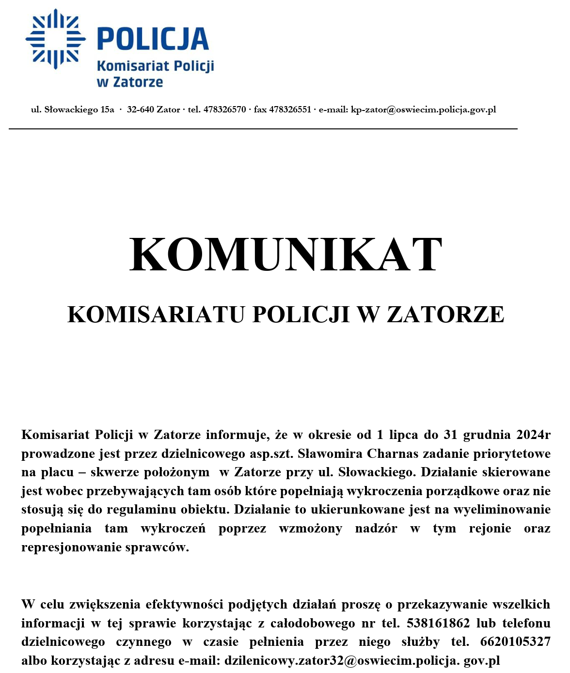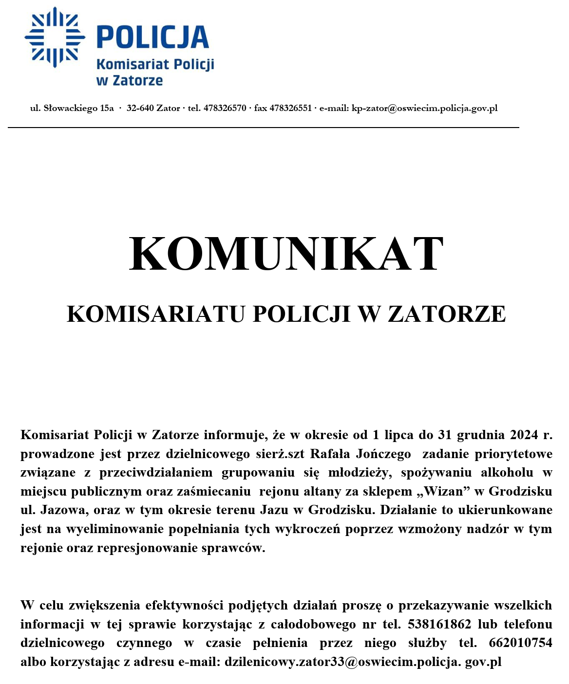 Komisariat Policji w Zatorze od 03.07.2020r., jak wszystkie jednostki Policji w kraju zmienił nr telefonu miejskiego.
