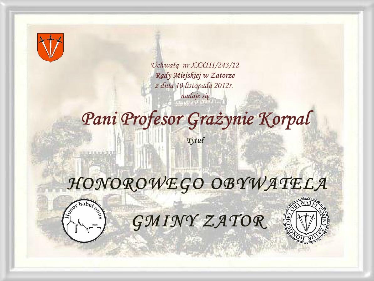 10 listopada 2012 roku podczas uroczystych obchodów 720 rocznicy lokacji Zatora odbyła się uroczysta sesja Rady Miejskiej w Zatorze podczas której nadano tytuł Honorowego Obywatela Gminy Zator dla Profesor Grażyny Korpal z Akademii Sztuk Pięknych w Krakowie.