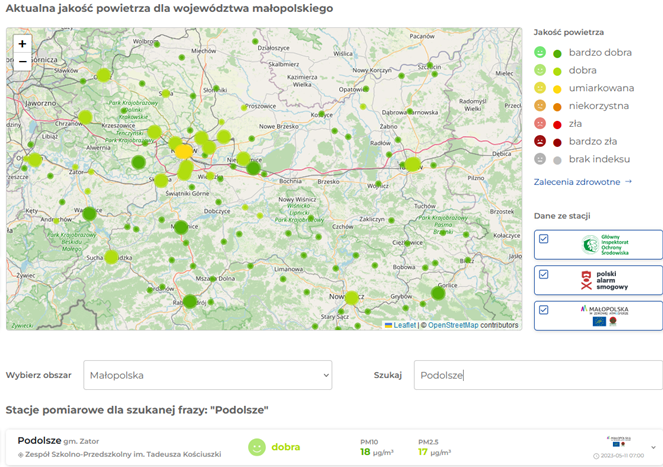 Na wskazanej powyżej stronie zamieszczona jest mapa ilustrująca bieżącą jakość powietrza dla województwa małopolskiego, na której można odczytać pomiary również z czujnika zamontowanego na budynku szkoły w Podolszu.
