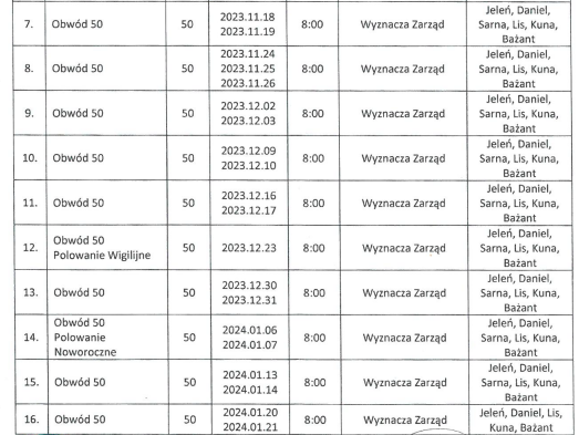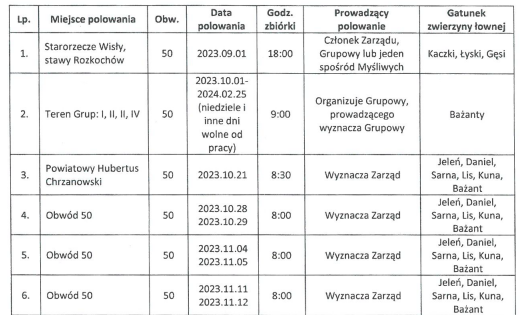 W razie złych warunków atmosferycznych Zarząd zastrzega sobie prawo zmiany terminów polowań. Planowane polowania trwają do zmierzchu.
