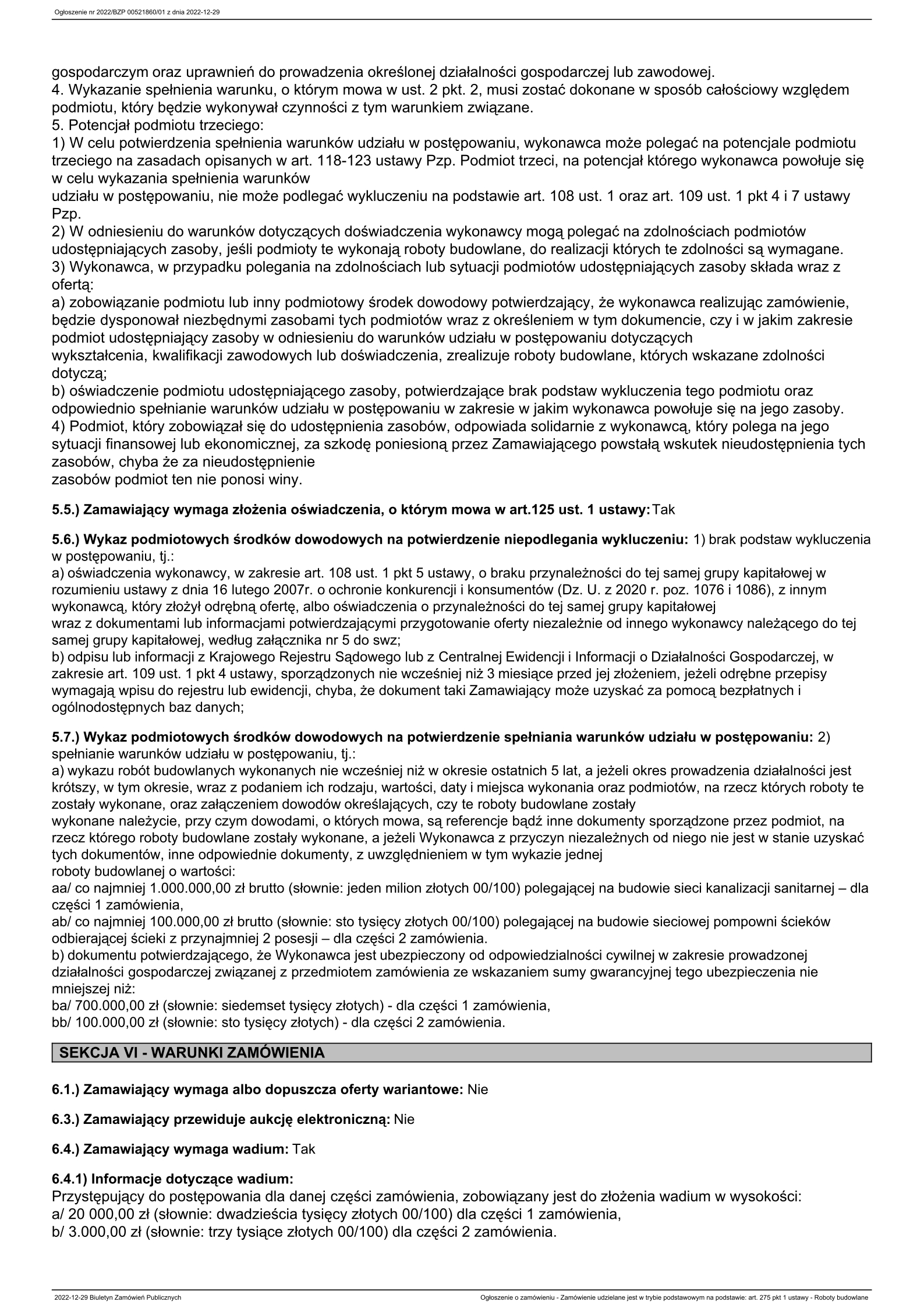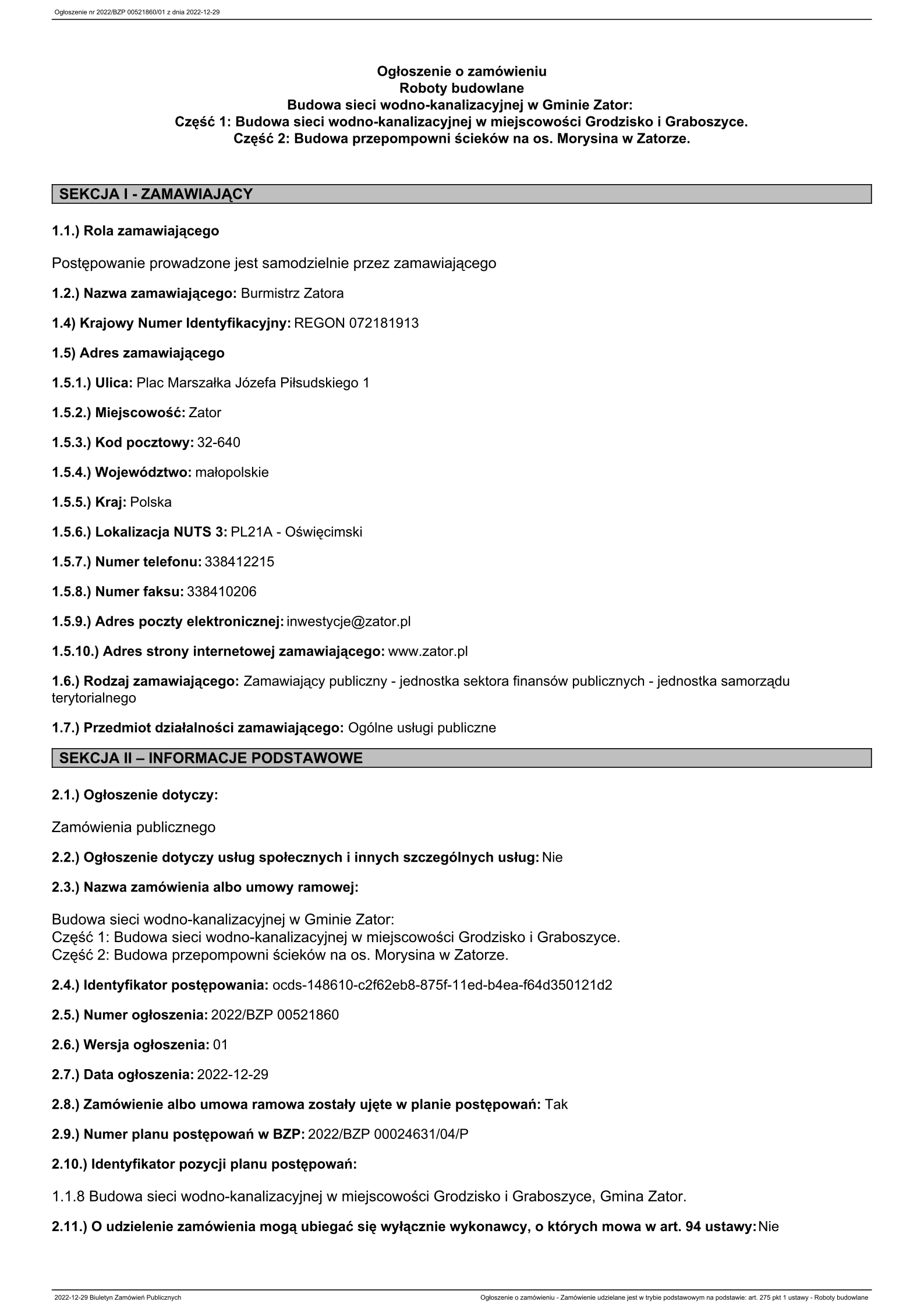 DI.271.12.2022 Budowa sieci wodno-kanalizacyjnej w Gminie Zator realizowane w dwu oddzielnych częściach: 1. Część 1: Budowa sieci wodno-kanalizacyjnej w miejscowości Grodzisko i Graboszyce, Gmina Zator. 2. Część 2: Budowa przepompowni ścieków na ...