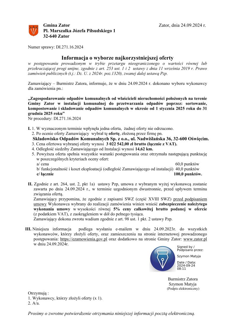 DI.271.16.2024 Zagospodarowanie odpadów komunalnych od właścicieli nieruchomości położonych na terenie Gminy Zator w instalacji komunalnej do przetwarzania odpadów w 2025 roku - informacja o wyborze najkorzystniejszej oferty.