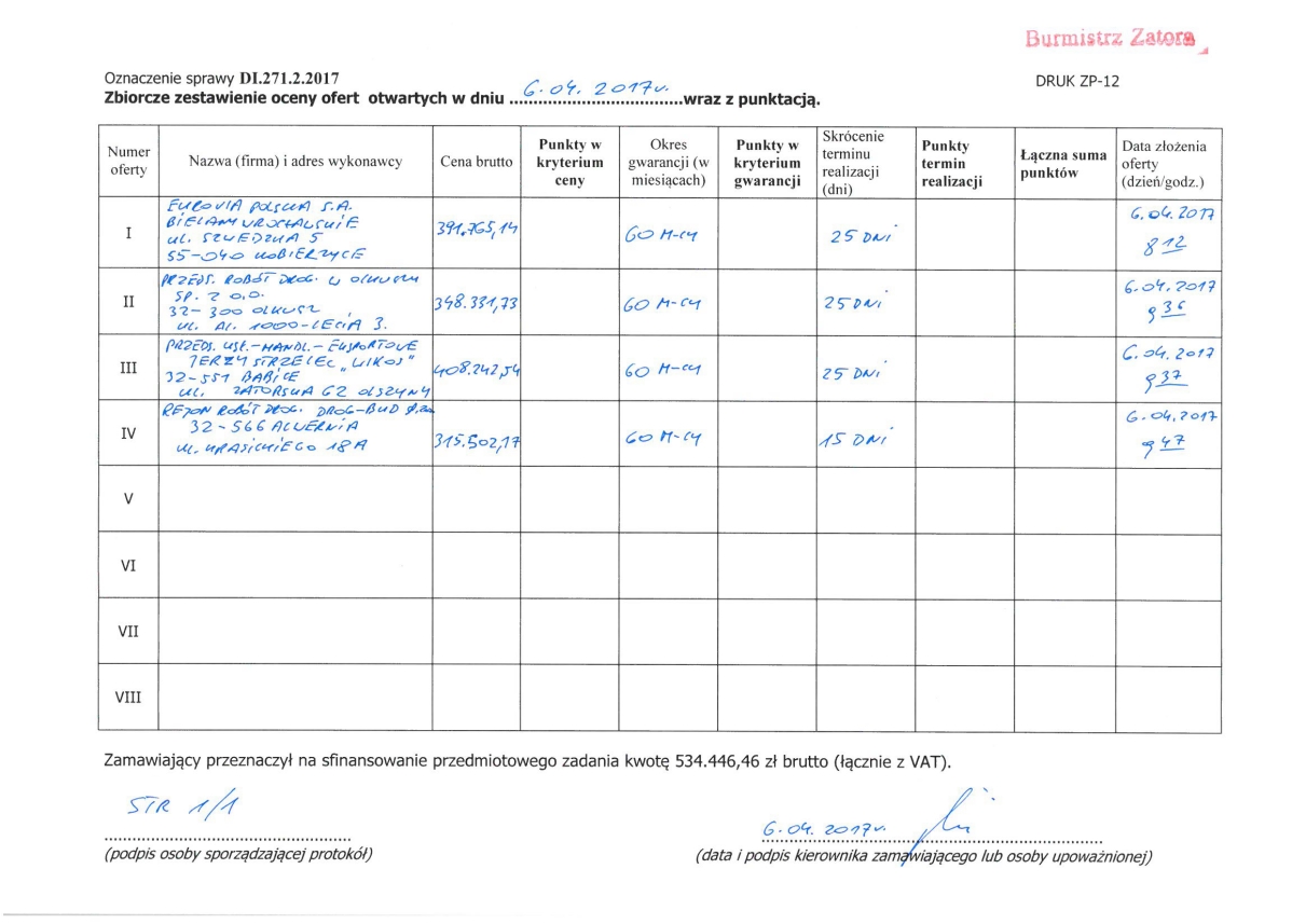 Zamawiający zamieszcza w załączeniu „zbiorcze zestawienie otwartych ofert…” dotyczące Modernizacji drogi dojazdowej do pól - ul. Stawowej w Zatorze, o długości ok. 980 mb, z informacjami, zgodnie z art. 86 ust. 5 ustawy Prawo zamówień publicznych.