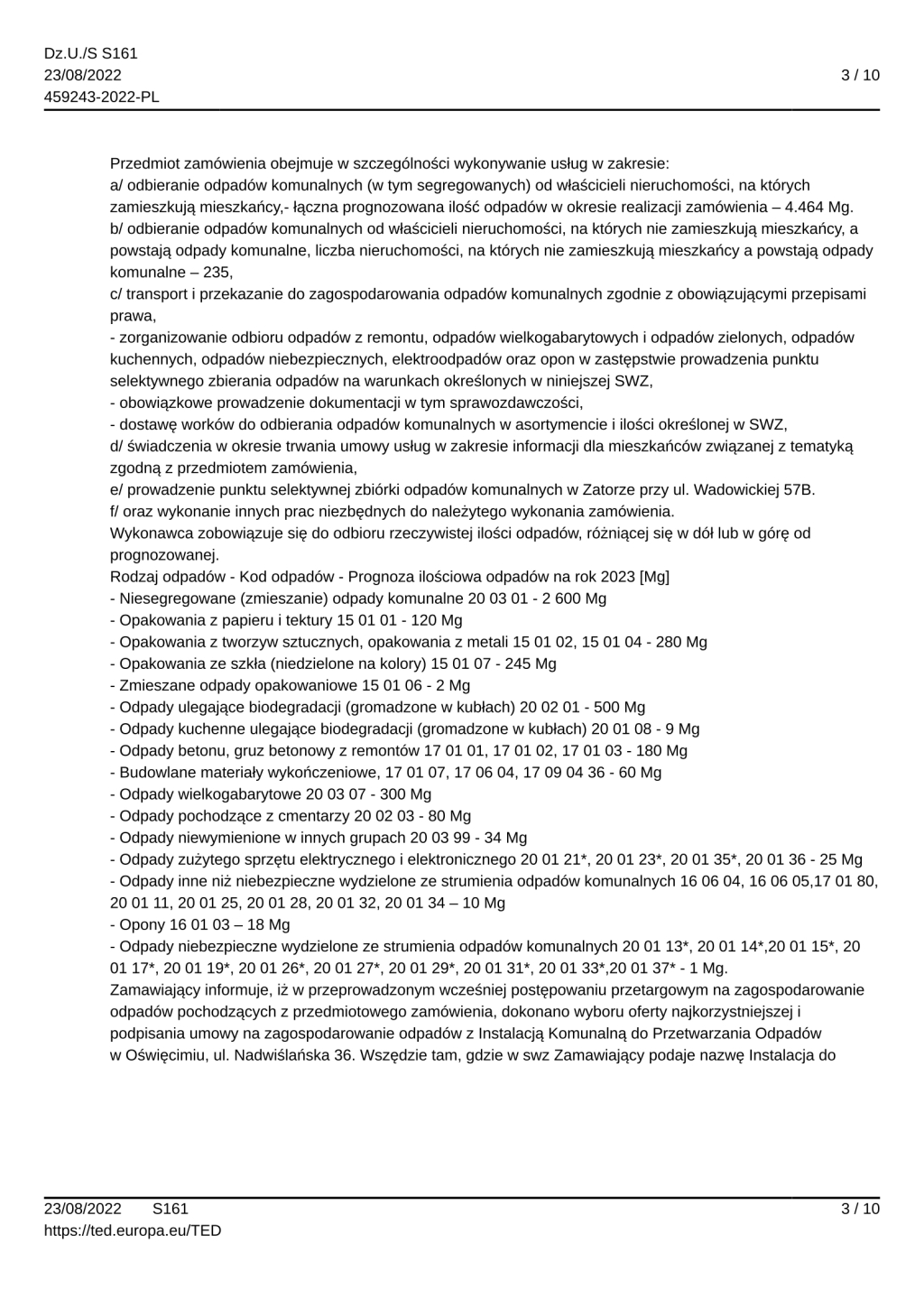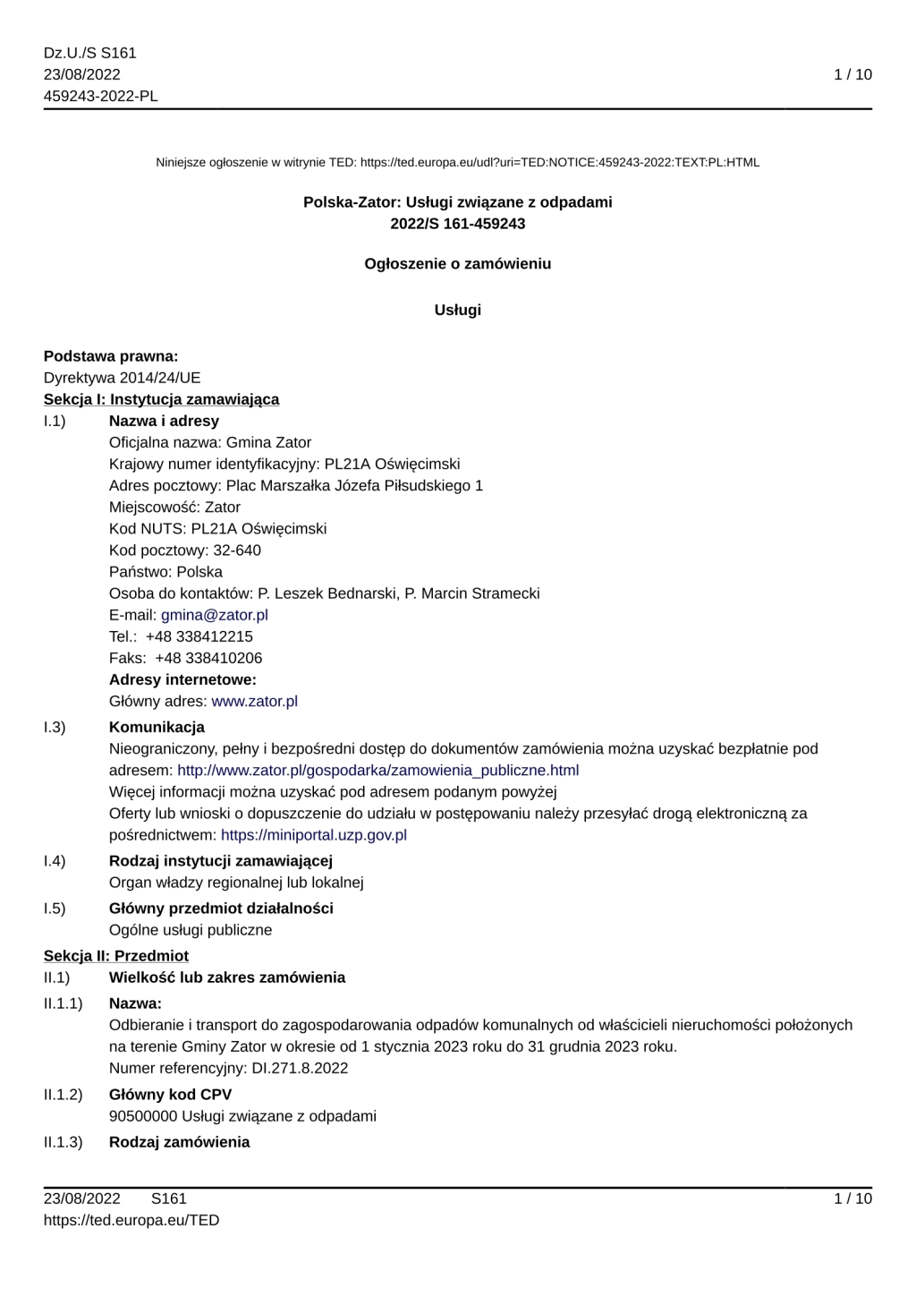DI.271.8.2022 Odbieranie i transport do zagospodarowania odpadów komunalnych od właścicieli nieruchomości położonych na terenie Gminy Zator w okresie od 1 stycznia 2023 roku do 31 grudnia 2023 roku.