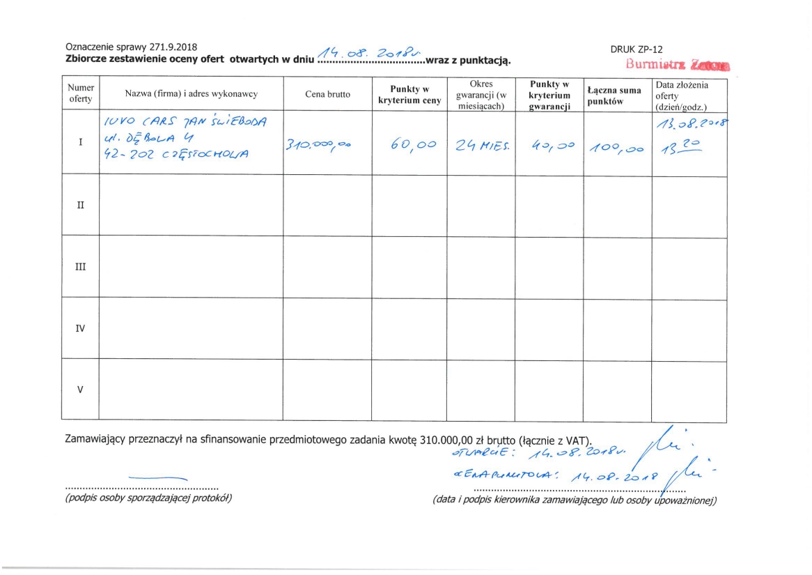 Zamawiający zamieszcza w załączeniu „zbiorcze zestawienie otwartych ofert…” z informacjami, zgodnie z art. 86 ust. 5 ustawy Prawo zamówień publicznych.