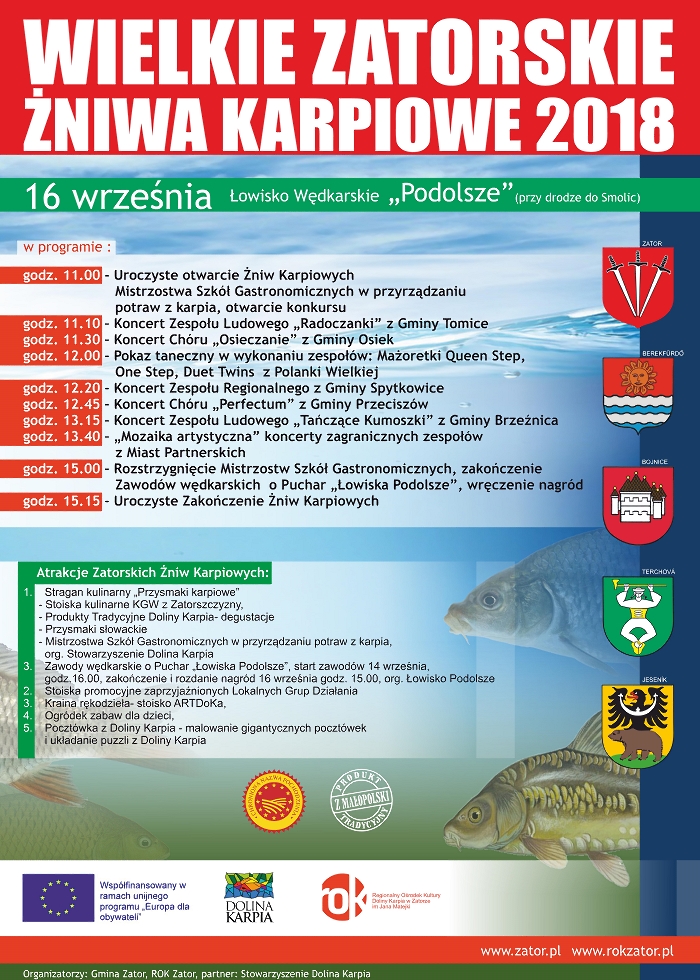16.09.2018 w niedzielę zorganizowano Piknik Rodzin Unii Europejskiej pt. Europejskie Żniwa Karpiowe - Artystyczne prezentacje miast partnerskich. Podczas imprezy na scenie zaprezentowali się artystycznie i kulinarnie zaproszeni goście (prezentacja artystyczna - Berekfurdo, prezentacja artystyczna - Bojnice, węgierska prezentacja kulinarna, słowacka prezentacja kulinarna, międzynarodowe stoiska rękodzielników ludowych, warsztaty dla najmłodszych - malowanie flagi projektu).