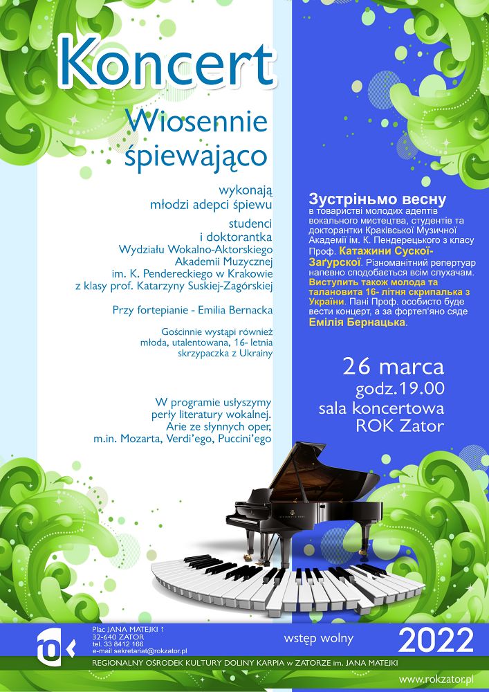 Зустріньмо весну в товаристві молодих адептів вокального мистецтва, студентів та докторантки Краківської Музичної Академії ім. К. Пендерецького з класу Проф. Катажини Сускої- Заґурскої. Різноманітний репертуар напевно сподобається всім слухачам. Виступить також молода та талановита 16- літня скрипалька з України. Пані Проф. особисто буде вести концерт, а за фортеп‘яно сяде Емілія Бернацька.