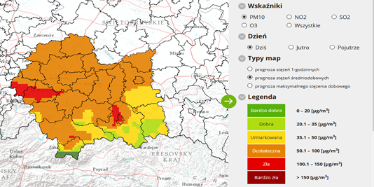 Główny Inspektorat Ochrony Środowiska powiadamia o ryzyku wystąpienia w dniu dzisiejszym tj; 15 listopada br. przekroczenia poziomu informowania pyłu zawieszonego PM10 na terenie powiatów: wadowickiego, oświęcimskiego, nowosądeckiego i miasta Nowy Sącz. Powiadomienie o ryzyku wystąpienia przekroczenia poziomu informowania dla pyłu zawieszonego PM10 przygotowano na podstawie prognozy zanieczyszczenia powietrza, wykonywanej przez Instytut Ochrony Środowiska-Państwowy Instytut badawczy (IOŚ-PIB) dostępnej na portalu „Jakość powietrza” GIOŚ pod adresem http://powietrze.gios.gov.pl/pjp/airPollution?woj=malopolskie