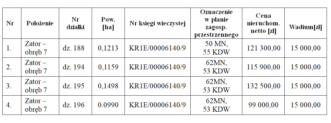 I. Przedmiotem przetargu będzie sprzedaż nieruchomości niezabudowanych położonych w Zatorze – obręb 7, w rejonie ul. Księstwa Zatorskiego, będących własnością Gminy Zator :