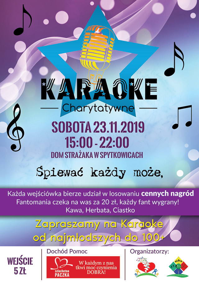 Serdecznie zapraszamy do udziału w wydarzeniu, które odbędzie się 23 listopada 2019 roku w Domu Strażaka w Spytkowicach od godziny 15.00 – 22.00. W myśl „Gdzie słyszysz śpiew - tam wchodź, tam dobre serce mają...” zapraszamy dzieci, młodzież i dorosłych do wspólnej muzycznej zabawy, a przy tym do niesienia pomocy tym, którzy najbardziej jej potrzebują.
