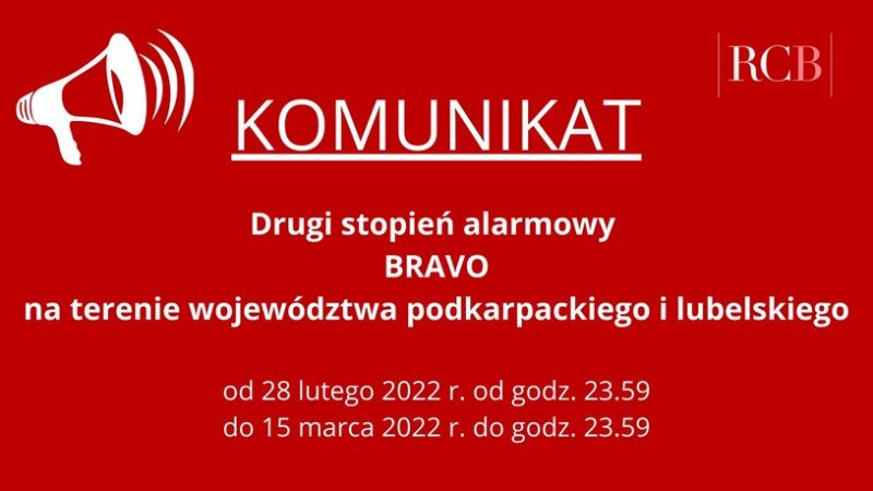 Premier Mateusz Morawiecki podpisał zarządzenie wprowadzające drugi stopień alarmowy BRAVO na terenie woj. podkarpackiego i lubelskiego. Jest to działanie o charakterze prewencyjnym. Decyzja szefa rządu o wprowadzeniu stopnia alarmowego wiąże się z aktualną dynamiczną sytuacją w Ukrainie oraz wzmożonym ruchem na granicy polsko-ukraińskiej. Stopień alarmowy obowiązuje do 15 marca do godz. 23:59.