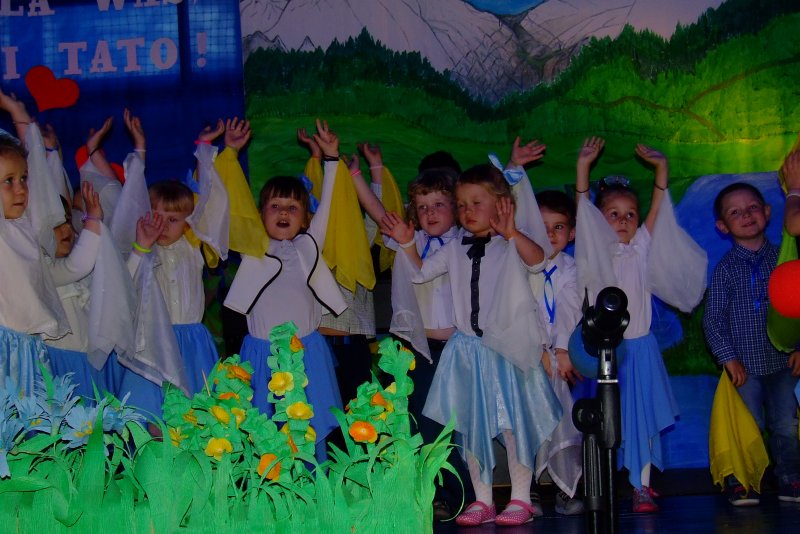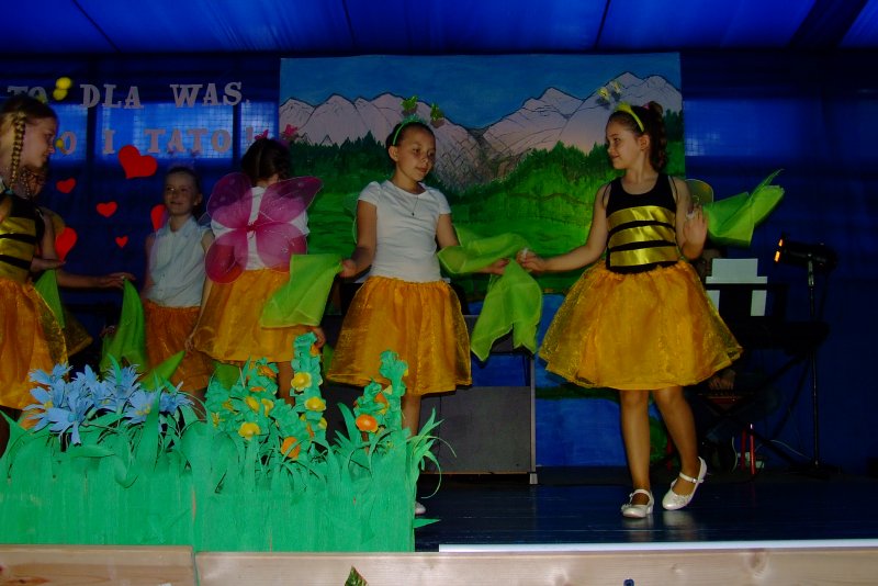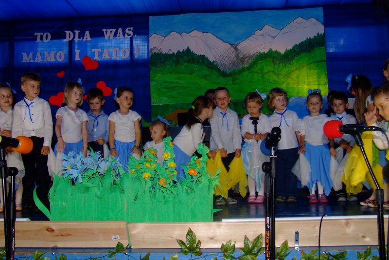 Sala gimnastyczna szkoły zamieniła się w prawdziwą salę widowiskową. Dekorację oraz przepiękne kostiumy dzieci robiły niesamowite wrażenie w trakcie spektaklu, podczas którego mali aktorzy dali z siebie wszystko, aby jak najpiękniej zaprezentować się przed rodzicami. Całość dopełniała oprawa muzyczna, o którą zadbał nauczyciel muzyki-pan Daniel Mruczek i uczniowie, których kształci na kółku muzycznym. Chórek wyśpiewywał piosenki o Mamie i Tacie, a instrumentaliści akompaniowali na gitarach, perkusji i keyboardzie.