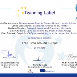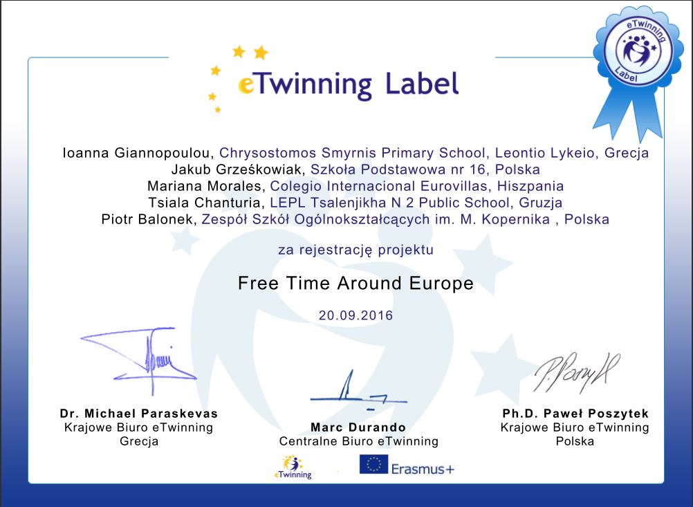 W bieżącym roku szkolnym piętnastoosobowa grupa gimnazjalistek pod opieką P. Balonka – nauczyciela wychowania fizycznego a zarazem koordynatorem projektu, przy współpracy z M. Szarek - Witek – nauczycielką języka angielskiego realizuje projekt pt. „Czas wolny w Europie”. Młodzież pracuje z partnerami z Grecji, Gruzji, Hiszpanii i Polski.