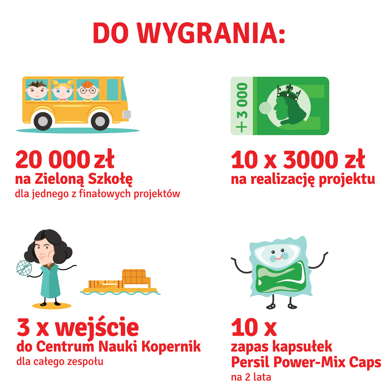 Na autorów najciekawszych projektów czekają fantastyczne nagrody. Każdy z 10 zwycięskich zespołów otrzyma dofinansowanie w wysokości 3 tys. zł na realizację swojego ekologicznego pomysłu. Projekt uznany za najbardziej innowacyjny zostanie nagrodzony grupowym wyjazdem na Zieloną Szkołę o wartości 20 tys. zł. Autorzy trzech wyróżnionych projektów otrzymają wejściówki do Centrum Nauki Kopernik w Warszawie, a wybrane placówki odwiedzi Rafał Kosik - ambasador konkursu. Dodatkowo na każdego z opiekunów zwycięskich projektów czeka 2-letni zapas kapsułek do prania Persil Power-Mix Caps