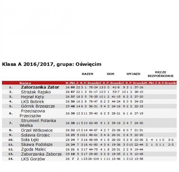 Sezon piłkarski 2016/17 dobiegł końca. W rozgrywkach seniorów A klasy Podokręgu Piłki Nożnej w Oświęcimiu zwycięzcą rozgrywek zostali zawodnicy LKS Zatorzanka Zator pokonując w ostatnim spotkaniu LKS Gorzów 4-2 czym przypieczętowali historyczny awans do ligi okręgowej. A Jak bardzo popularna jest piłka nożna widać było na trybunach przy ulicy Parkowej podczas wszystkich ligowych spotkań.