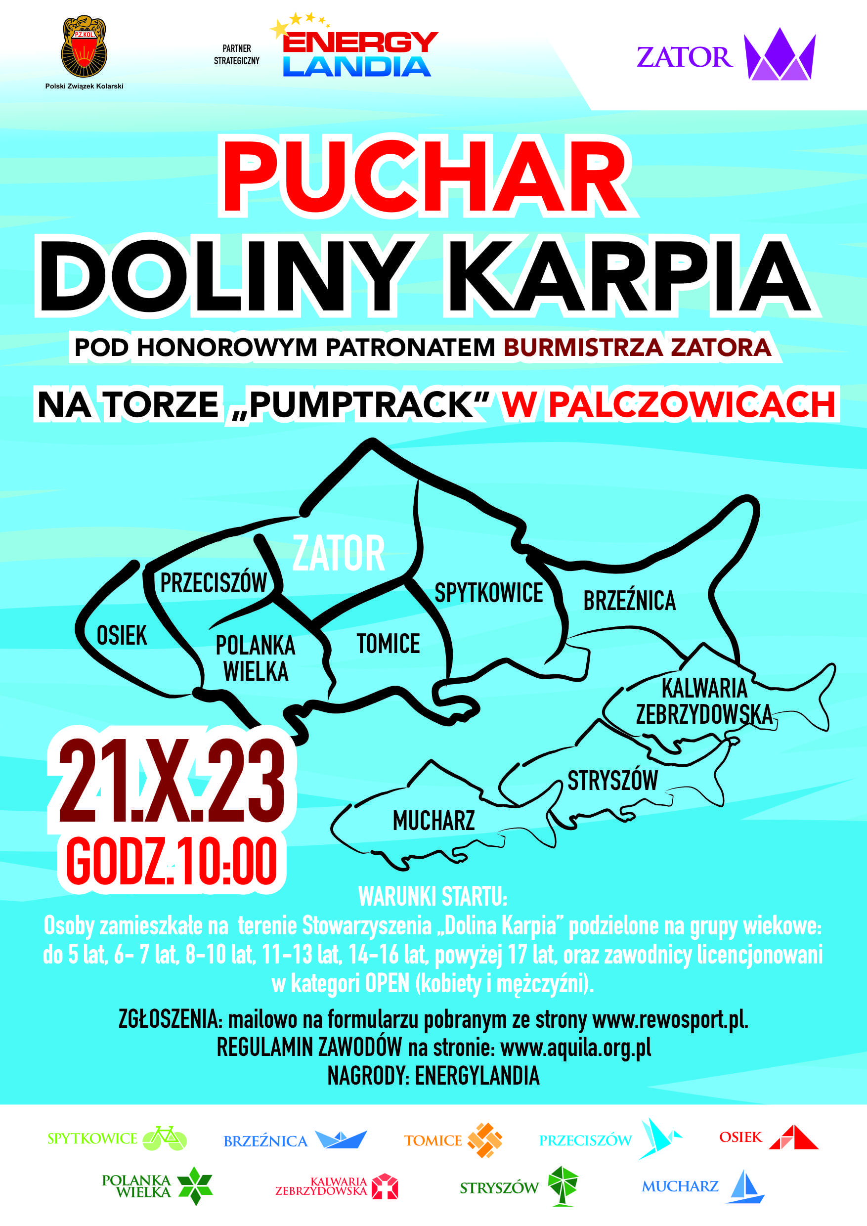 Serdecznie zapraszamy mieszkańców gmin Doliny Karpia do udziału w I Amatorskim Pucharze Rowerowym na torze "Pumptrack" w Palczowicach. Zawody zostaną zorganizowane w dniu 21.10.2023 r. (sobota) w godz.10:00 - 14:00. (Lokalizacja: 2F34+6Q Palczowice, https://maps.app.goo.gl/yBDxvJ1obpRRDHez9)