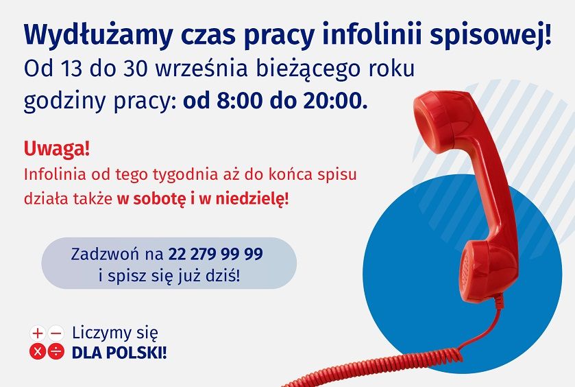 Od 13 do 30 września br. infolinia spisowa, działająca pod numerem 22 279 99 99, będzie do Państwa dyspozycji każdego dnia – również w soboty i niedziele - w godzinach od 8:00 do 20:00 (opłata za połączenie zgodna z taryfą operatora).