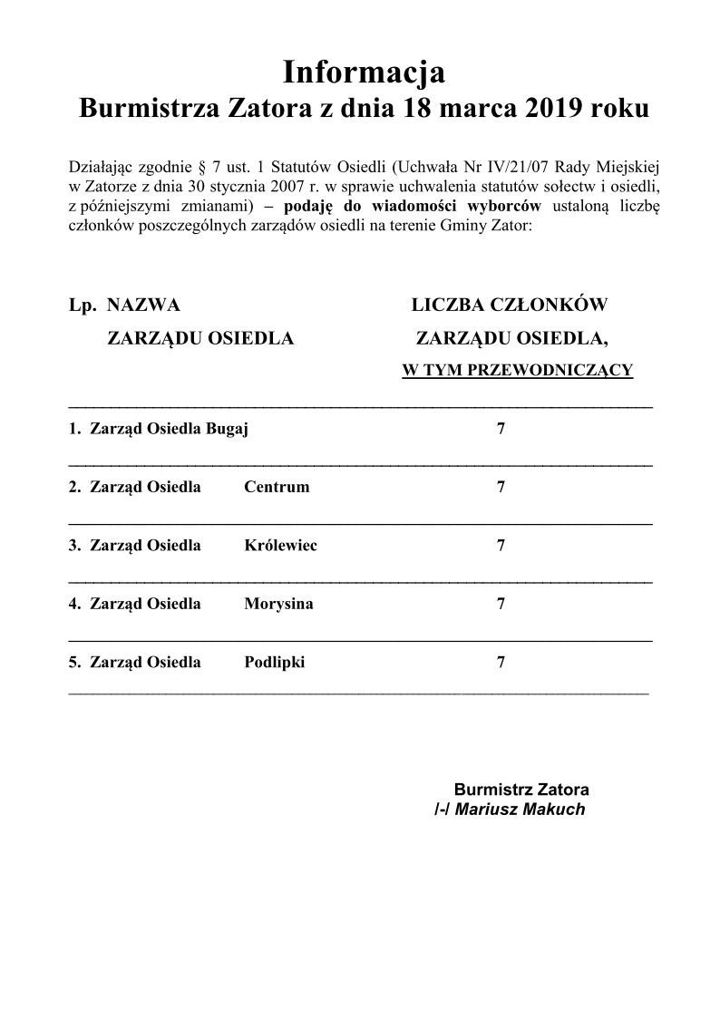 Informacja Burmistrza Zatora z dnia 18 marca 2019 roku ustalonej liczby członków poszczególnych zarządów osiedli na terenie Gminy Zator