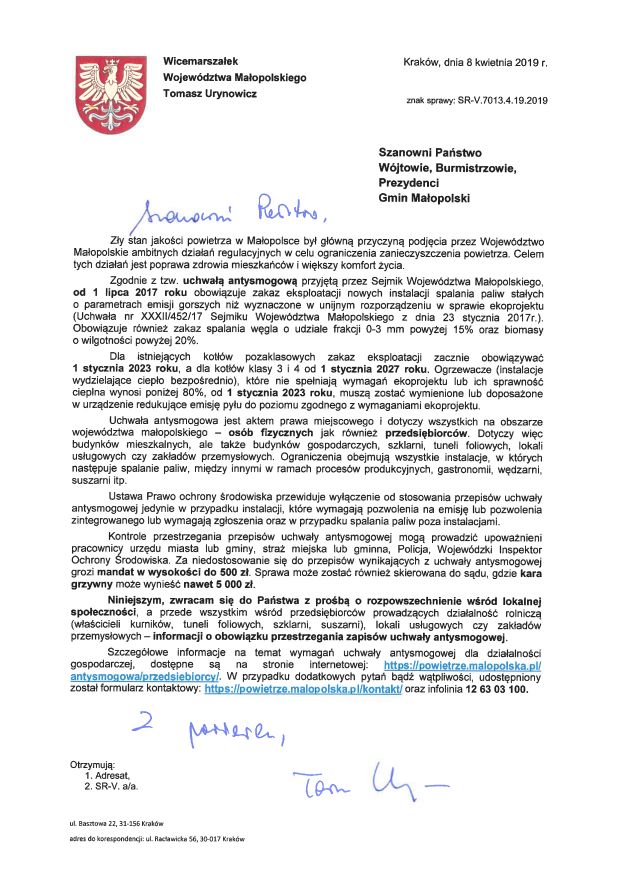 Informacja Wicemarszałka Województwa Małopolskiego do przedsiębiorców o obowiązku przestrzegania uchwały antysmogowej 2019-04-24