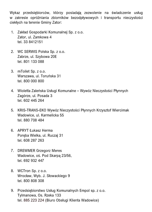 Zgodnie z art. 5 ust.1 pkt 3a i 3b oraz art. 6 ust. 1 ustawy z 13 września 1996 r. o utrzymaniu czystości i porządku w gminach (t.j. Dz.U. z 2024 r. poz. 399) oraz regulaminem utrzymania czystości i porządku na terenie Gminy Zator, przyjętym uchwałą nr XVI/98/19 Rady Miejskiej w Zatorze z dnia 10 grudnia 2019 r., zmienionym uchwałą nr LXI/430/23 Rady Miejskiej w Zatorze z dnia 26 września 2023 r., właściciele nieruchomości, których budynki mieszkalne nie zostały podłączone do kanalizacji sanitarnej zobowiązani są do: