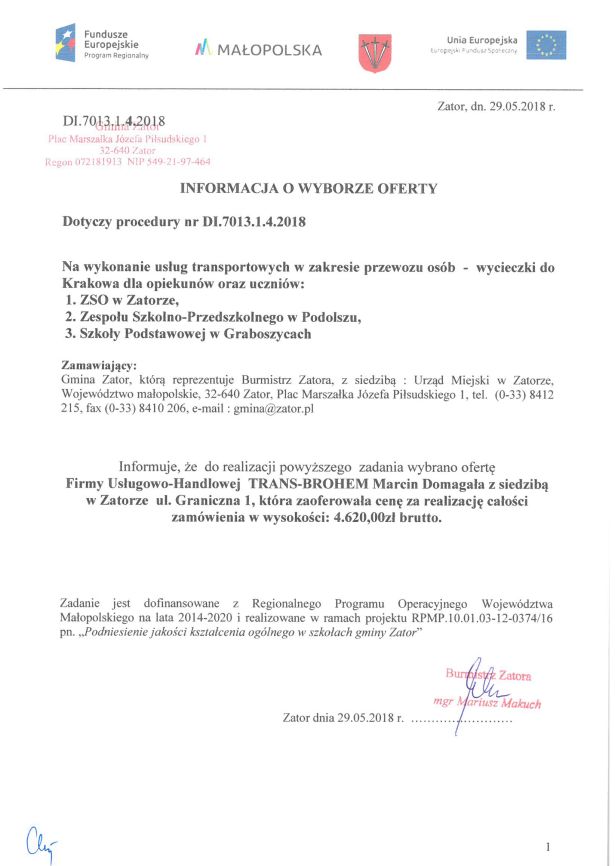 Informacja o wyborze oferty dot. procedury: DI.7013.1.4.2018 2018-05-29