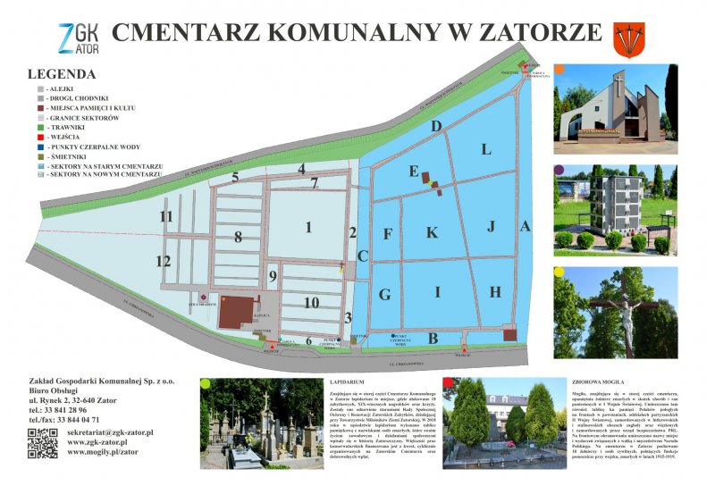 Na stronie znajduje się Interaktywny Plan Cmentarza, na którym można odnaleźć dane o każdym grobie i osobach w nich pochowanych wraz z miniaturą zdjęcia. Najważniejsza jest wyszukiwarka (prawy górny róg strony www.mogily.pl/zator), w której po wpisaniu nazwiska i imienia możemy odnaleźć pochowanego. Sortowanie umożliwia odnalezienie osób najstarszych, najwcześniej urodzonych lub zmarłych. Na stronie, w zakładce Pogrzeby, na bieżąco umieszczane są nekrologi. Zakładka Rocznice przypomina o osobach zmarłych danego dnia kalendarzowego.