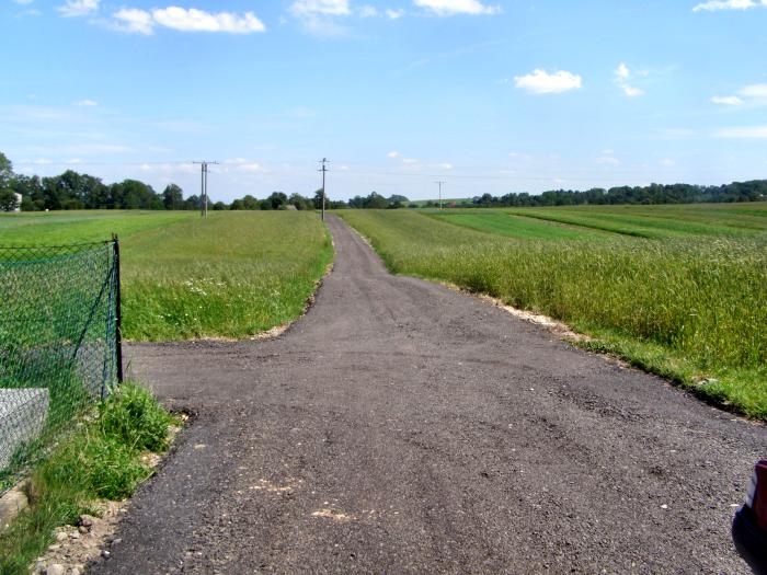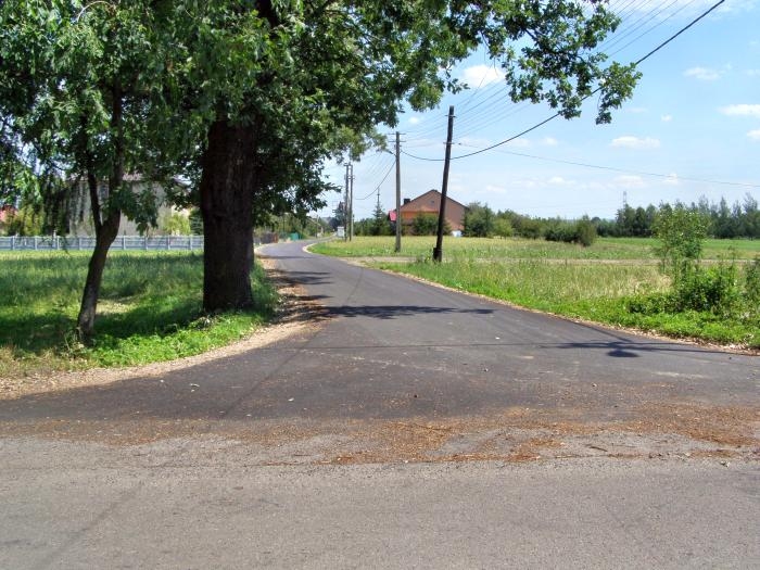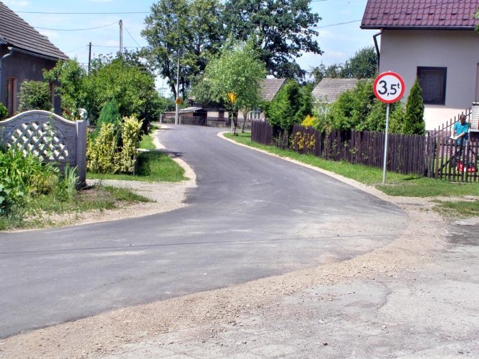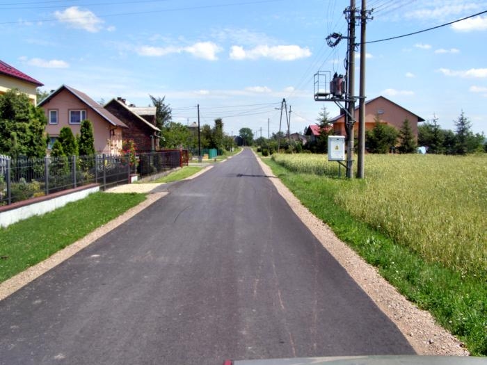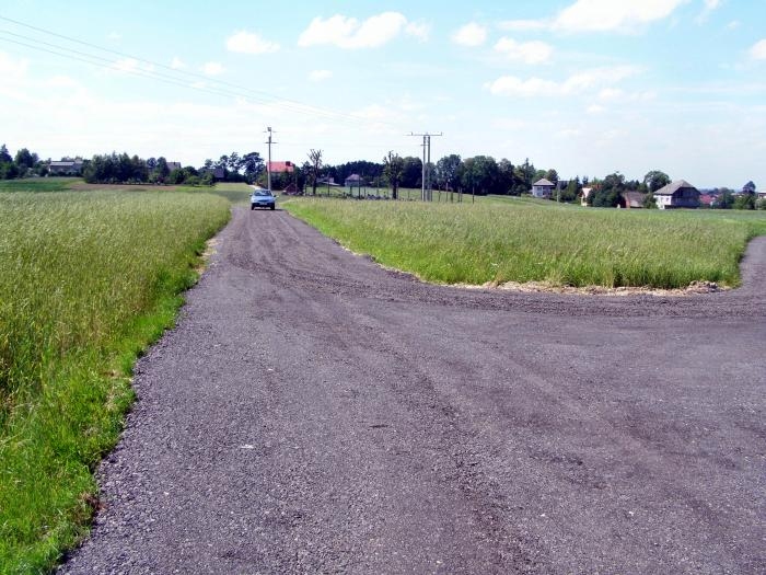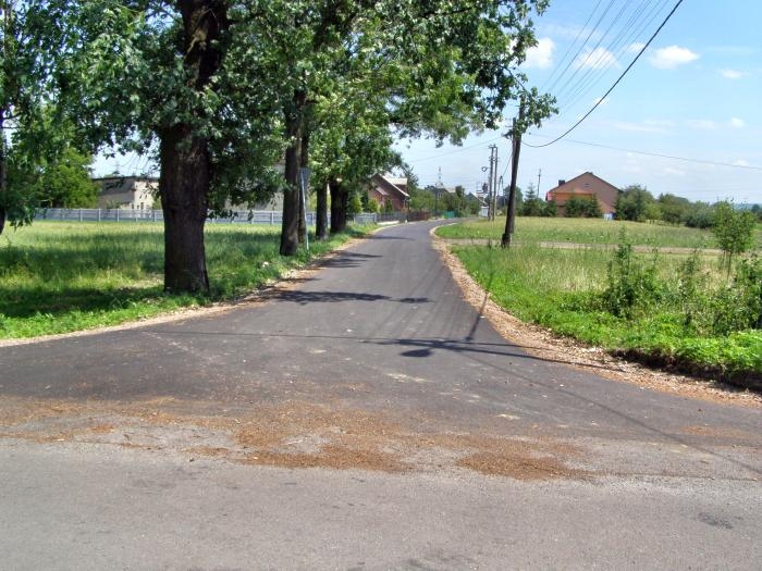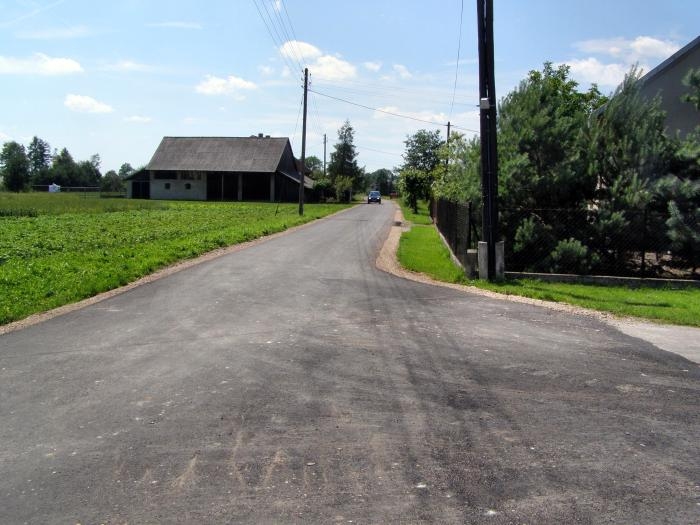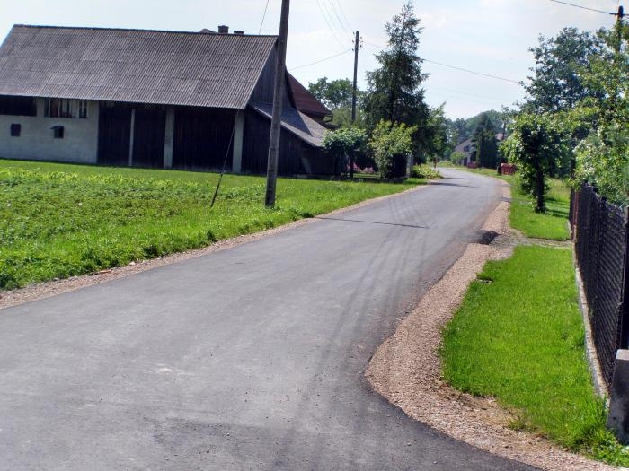 Opis inwestycji: Wykonano poszerzenie drogi o 1,1 metra (0,6m asfaltu i 0,5m pobocza) na całej długości 670 metrów (504 m2 masy asfaltowej) oraz 85 mb nowej nawierzchni na całej szerokości drogi.