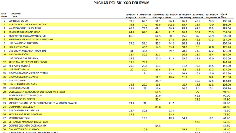 Puchar Polski MTB w formule olimpijskiej, to najważniejszy cykl zawodów kolarskich w naszym kraju. Świadczy o tym nie tylko udział wszystkich najmocniejszych drużyn krajowych, ale również fakt obsady międzynarodowej, w osobach znanych gwiazd światowego kolarstwa. Cały cykl składał się z 7 edycji, które odbyły się w Białymstoku, Lublinie, Wałbrzychu, Pcimiu, Głuchołazach, Jeleniej Górze i Boguszowie Gorcach. Zmagania trwały od kwietnia do końca września. Punkty dla drużyny, zdobywało pięciu najlepszych jej zawodników, w każdej z eliminacji. Z kolei do końcowej klasyfikacji drużyn, liczyły się wyniki pięciu najlepszych wyścigów , spośród siedmiu rozegranych w tym roku. Nasi kolarze już od piątej eliminacji byli liderami, mimo, iż po szóstej spadli na drugie miejsce, to i tak odliczając najgorsze wyniki zachowali szanse na końcowy triumf. Do finału przystąpili zmotywowani i pełni wiary w końcowy sukces. Wszyscy zawodnicy stanęli na wysokości zadania i wykonali swoją pracę zgodnie z założeniami - a nawet lepiej. Znakomita jazda w finale spowodowała, że to zawodnicy UKS SOKÓŁ występujący w tym sezonie pod nazwą SUPERIOR ZATOR – zostali LIDERAMI KLASYFIKACJI GENERALNEJ PUCHARU POLSKI 2018! To najlepszy wynik naszych zawodników jaki dotychczas uzyskali w tej rywalizacji. Do rywalizacji przystąpiły 74 ekipy z kraju i zagranicy, w tym z Meksyku , Czech, Holandii czy USA. To zwycięstwo to zasługa wszystkich osób i instytucji, którzy wspierali zatorską ekipę. To również sukces Gminy Zator, która konsekwentnie pracują na rozwój nie tylko gospodarczyregionu, ale również sportowy wszystkich organizacji z terenu Zatorszczyzny.