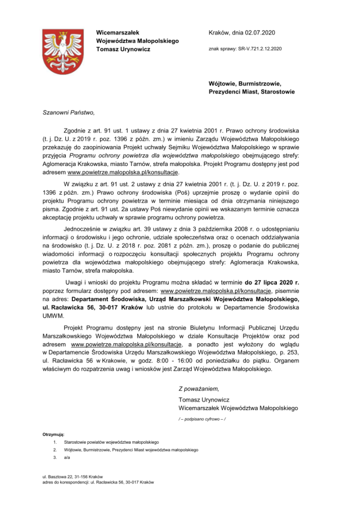 Konsultacje społeczne projektu Programu ochrony powietrza dla woj. małopolskiego. Uwagi i wnioski do 27.07.2020 r 2020-07-24