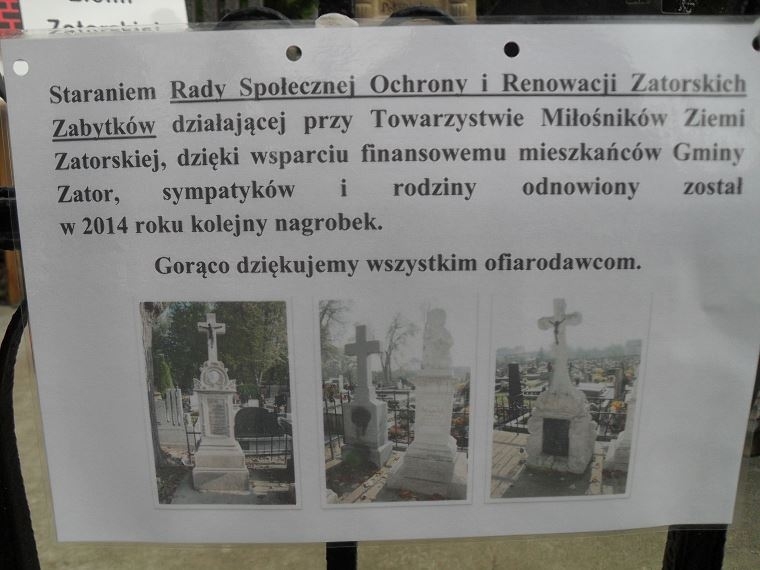W dniu Wszystkich Świętych na zatorskim cmentarzu przeprowadzono kwestę z inicjatywy TMZZ i Rady Społecznej Odnowy Zatorskich Zabytków. Zebrano 7793 tysiące złotych. Cel zbiórki prace związane z odnową zatorskich zabytków/nagrobków/. W kweście uczesniczyło 30 osób. Dziękujemy wszystkim, którzy wsparli datkami to dzieło. W tym roku odnowiony został nagrobek 19 wieczny, przy wsparciu finansowym mieszkańców Zatora, rodziny i ludzi dobrej woli.
