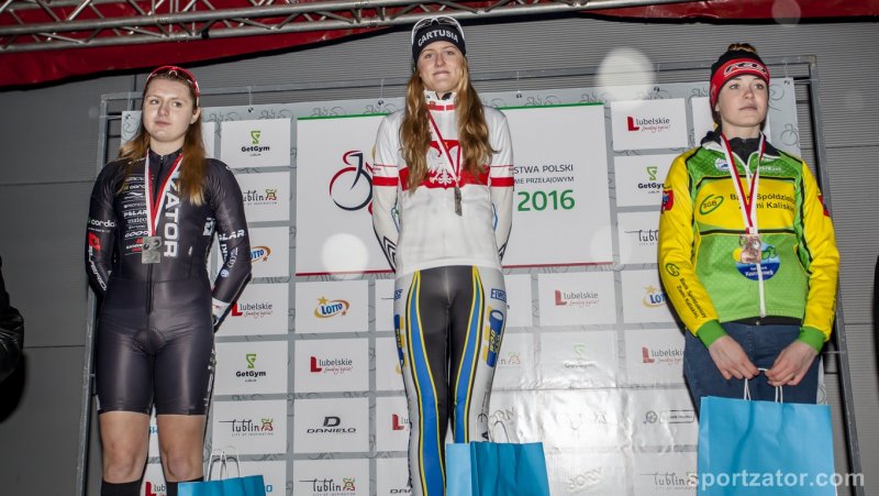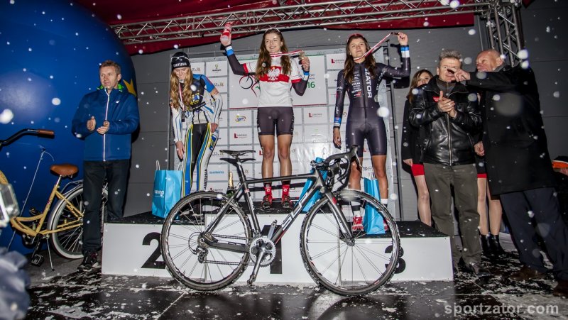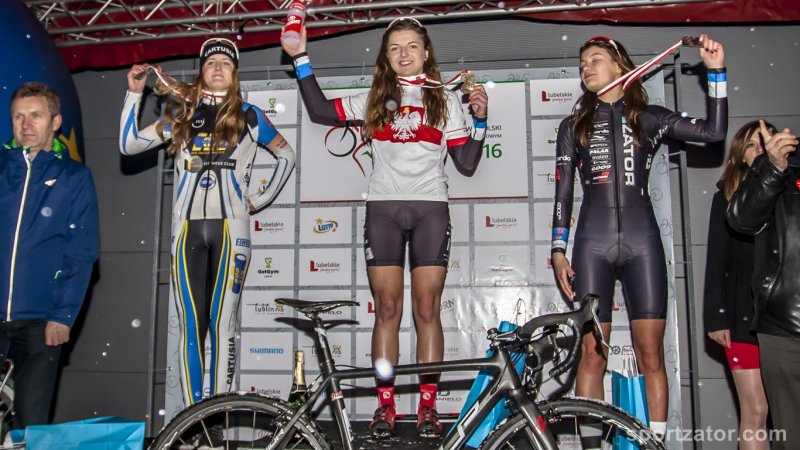 Rewelacyjne wieści z79 Mistrzostw Polski w kolarstwie przełajowym Lublin 2016. Mamy trzy medale Mistrzostw! Złoty srebrny i brązowy. Nasze zawodniczki nie tylko były najliczniejszą drużyną w stawce wyścigu, ale również najskuteczniejszą. Żaden klub nie mógł się cieszyć taką ilością zdobytych medali. Mistrzynią kraju w kategorii U23 na rok 2016 zostaje Rita Malinkiewicz. W tej samej kategorii z brązowego medalu i tytułu mistrzowskiego , cieszyła się również Gabriela Wojtyła. Choć pozostał niedosyt, bo przez większość dystansu jechała na drugiej pozycji, by po kilku upadkach stracić tą lokatę. Pościg za srebrem był ambitny, a na mecie zabrakło tylko 5 sekund. Gdyby wyścig trwał odrobinę dłużej, niewątpliwie srebro byłoby dla Gabrysi. Najwięcej radości na mecie sprawiła sobie, całej ekipie i rodzicom Karolina Włoch. Po wspaniałej walce na trasie, mądrej taktyce, Karolina zostaje Wicemistrzynią Polski w kategorii juniorek jako pierwszoroczna zawodniczka. Jest to pierwszy medal Mistrzostw Polski naszej najmłodszej wychowanki UKS Sokół! Tym samym dołączyła do grupy Mistrzyń Polski z Zatora. Grupy, jaką mało który klub w Polsce, może się aktualnie pochwalić. W Lublinie bardzo dobrze poradziła sobie trenująca od niedawna w zatorskim klubie Dagmara Drabik. Był to jej najlepszy występ w sezonie i jest dowodem, że cała ekipa idealnie trafiła z formą. Dziękujemy wszystkim, którzy przyczynili się do tak wspaniałego podsumowania trzymiesięcznego okresu przygotowań do Mistrzostw. Dziękujemy kibicom, tym dopingującym na trasie i tym oglądającym relację na żywo w telewizji. Kolejny start już w najbliższy weekend w Tarnowie. Zapraszamy do kibicowania naszym zawodniczkom.
