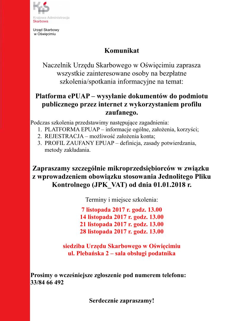 Naczelnik Urzędu Skarbowego w Oświęcimiu zaprasza wszystkie zainteresowane osoby na bezpłatne szkolenia/spotkania informacyjne
