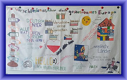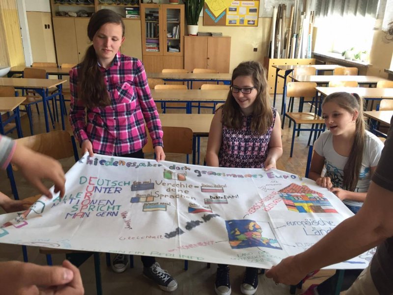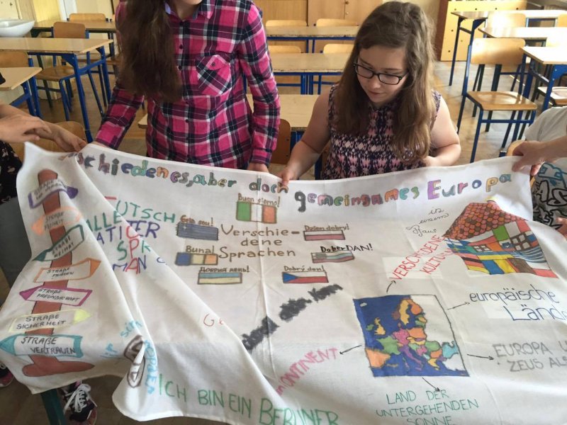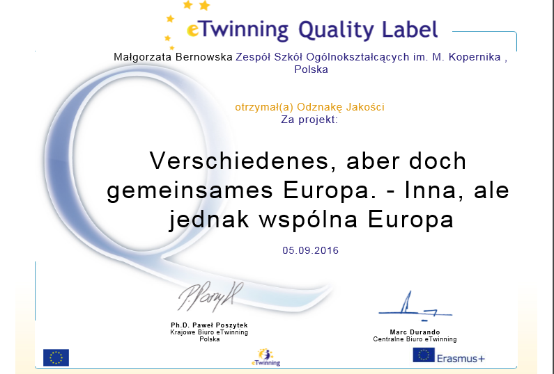 5 września kolejna grupa projektowa gimnazjum ZSO Zator otrzymała już drugą Krajową Odznakę Jakości za projekt eTwinning z języka niemieckiego „Verschiedenes, aber doch gemeinsames Europa” - „Różnorodna, ale przecież wspólna Europa”. Celem projektu było poszukiwanie różnic i wspólnych elementów definiujących Europę w krajach szkół partnerskich. Uczniowie poznawali kraje partnerskie, prezentowali swoje szkoły oraz miejscowość wylosowanego partnera projektu. Poznali nowe narzędzia ICT szukając wspólnych elementów życia w Europie ( burza mózgów Tricider, wirtualna tablica „korkowa” Padlet, wirtualna mapa mentalna Mind42, prezentacje Prezi, Glogster, Emaze). Końcowym efektem była chusta- plakat z napisami i rysunkami dotyczącymi wspólnych elementów Europy, która podróżowała przez wszystkie kraje partnerskie, z Grecji, poprzez Rumunię, Ukrainę, Włochy, Słowenię, Czechy.