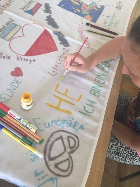 Partnerzy wymienili informacje o o swoich miejscowościach. My przygotowaliśmy prezentacje o partnerach z projektu- Rakovnik w Czechach i Izium na Ukrainie, co było wyzwaniem dla uczniów rozpoczynających naukę języka. W maju przygotowaliśmy się do quizu online (quizizz.com) odnoszącego się do wiedzy o krajach partnerskich oraz spotkań online z wykorzystaniem Skype. Efektami współpracy są wszystkie prezentacje umieszczone na platformie Twinspace., a chusta-plakat zapełniała się kolejnymi ideami wspólnej Europy. Na nią wszyscy uczestnicy projektu czekali z niecierpliwością. „Krajowa Odznaka Jakości przyznawana jest przez Krajowe Biuro eTwinning tym nauczycielom, których praca w ramach projektu osiągnęła określony poziom. Celem przyznawania Krajowej Odznaki Jakości jest wyróżnienie nauczycieli i szkół, których działania w ramach eTwinningu reprezentują wysoki poziom. Dla nauczycieli jest to uznanie ich pracy, dla uczniów to większa motywacja do prowadzenia zaplanowanych działań, a dla szkoły – publiczne potwierdzenie zaangażowania i dążenia do jakości oraz otwartość na współpracę europejską” - źródło http://www.etwinning.pl/odznaki-jakosci/