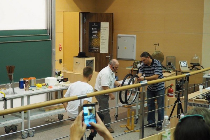 Grzmoty, błyski, huki, dymy, truchła, szkielety, oślizłe, szorstkie, zimne, gorące, małe i duże, atrybuty czarnoksiężników i czarownic. Kilka setek lat temu stos, dzisiaj nauka w swej najczystszej formie. Wspaniałe pokazy fizyczne ze znanymi nam już małymi problemami ze sprzętem zaprezentował nam pan dr Marek Głąb - wykładowca UJ. Newton i Bernoulli stali się nam bliscy jak znajomi z osiedla.