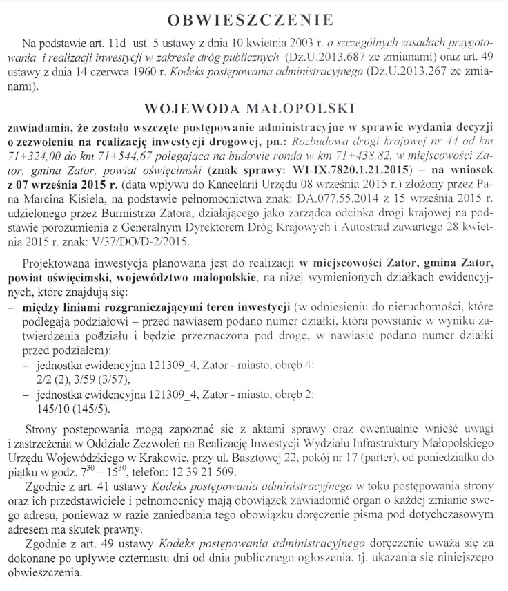 OBWIESZCZENIE WOJEWODY MAŁOPOLSKIEGO 2015-10-27