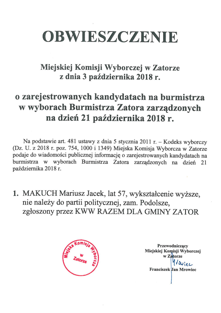 Obwieszczenie MKW w Zatorze o zarejestrowanych kandydatach na Burmistrza Zatora.pdf | 18-10-04 14:37 | 316.24KB | pobierz |