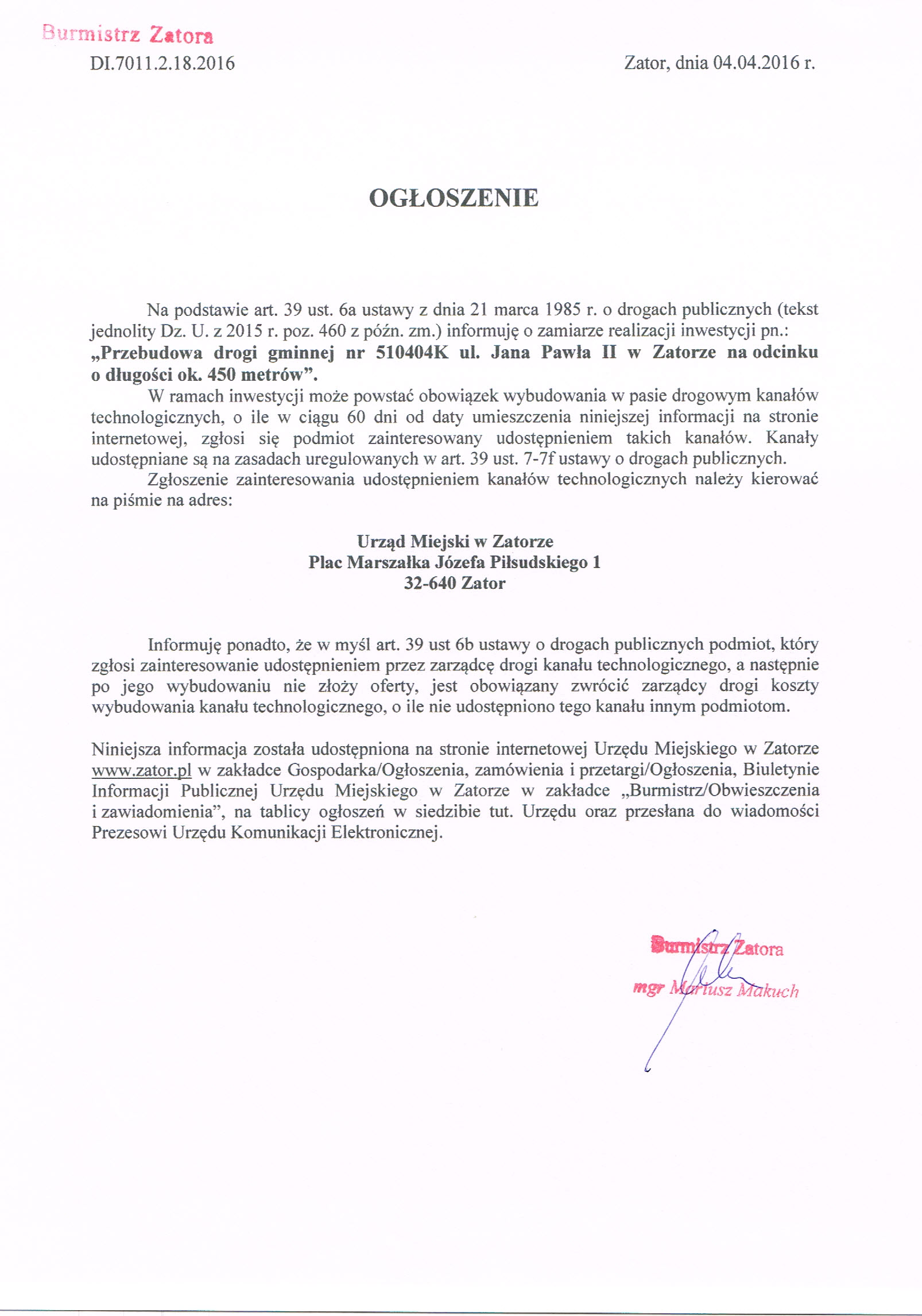 OGŁOSZENIE Burmistrza Zatora z dnia 4 kwietnia 2016r 2016-04-06
