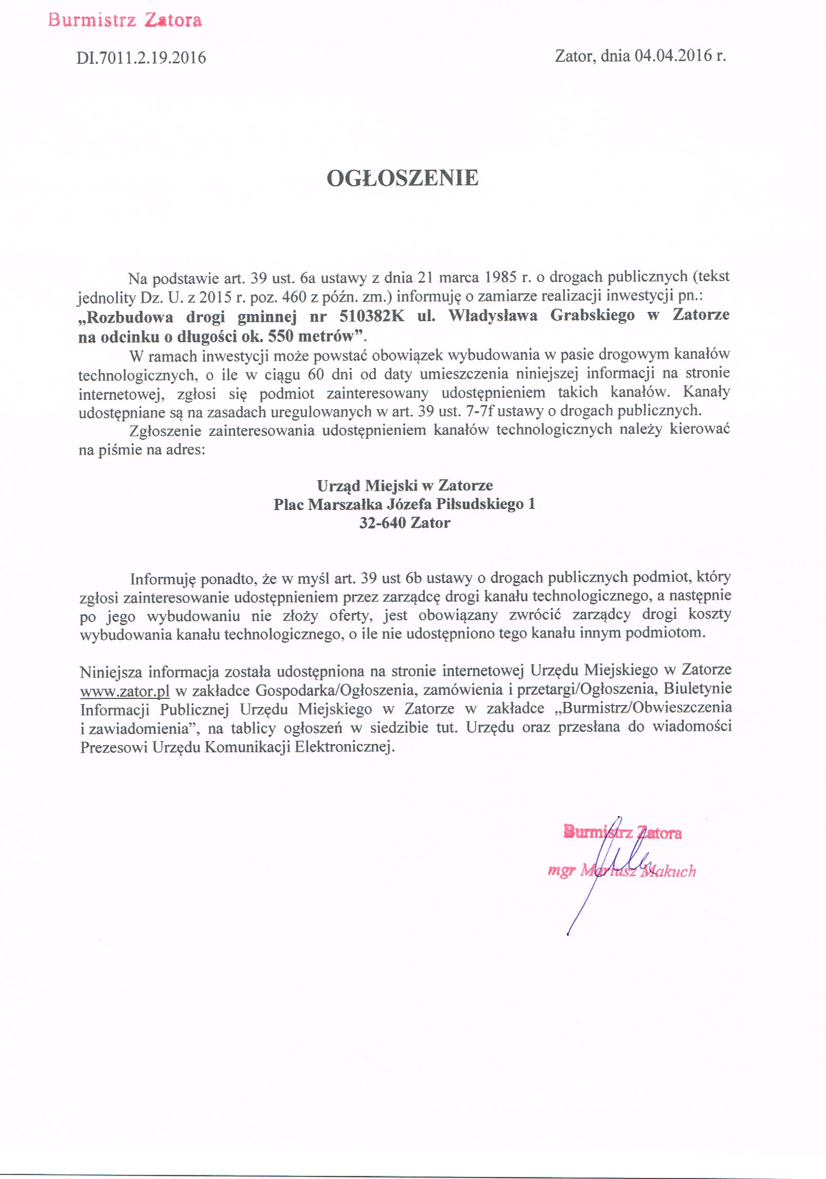 OGŁOSZENIE Burmistrza Zatora z dnia 4 kwietnia 2016r 2016-04-06