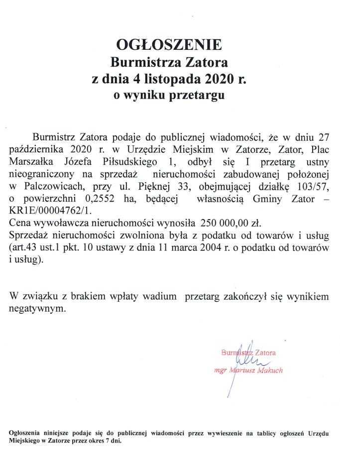OGŁOSZENIE Burmistrza Zatora z dnia 4 listopada 2020 r.o wyniku przetargu 2020-11-04