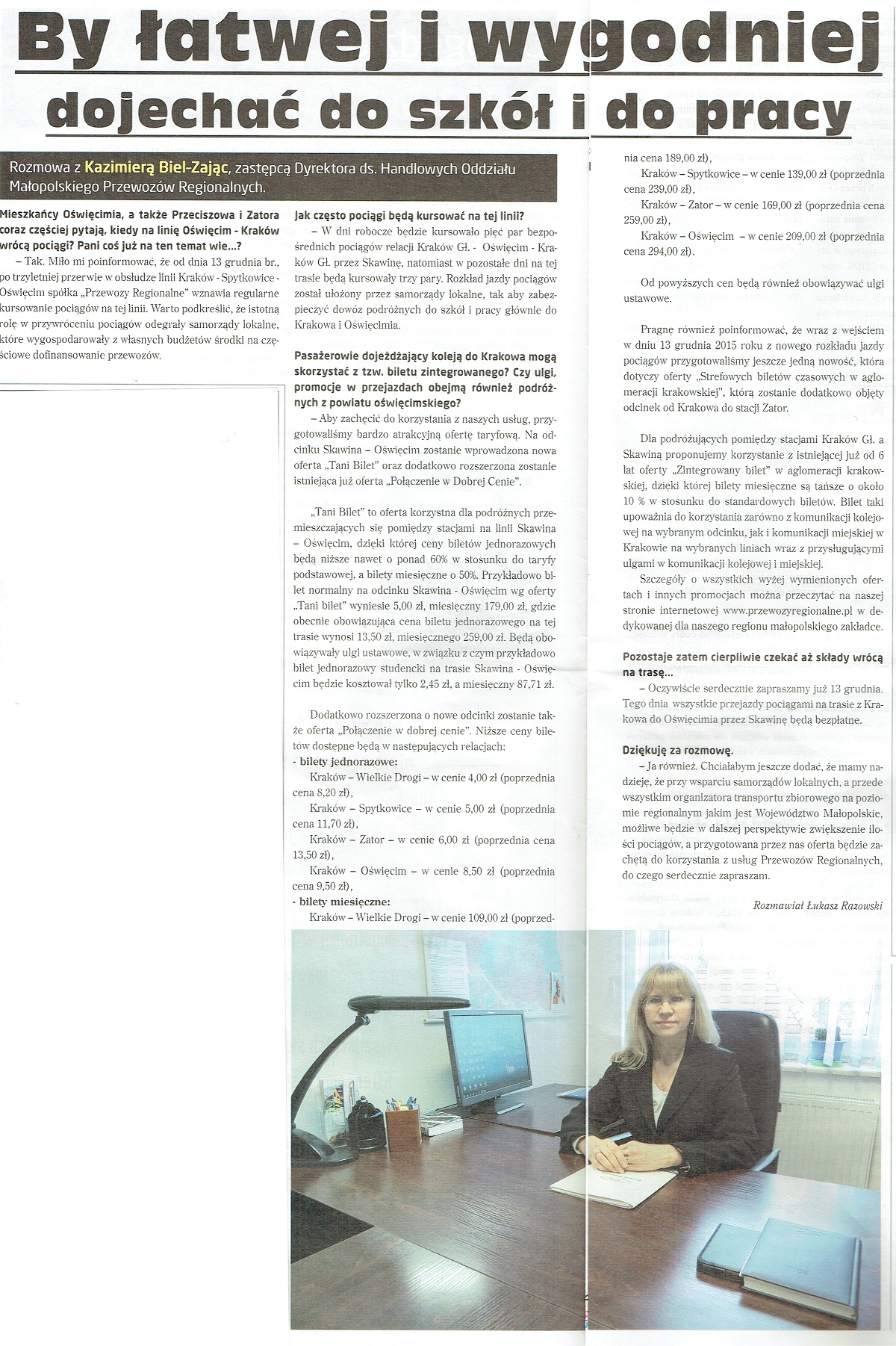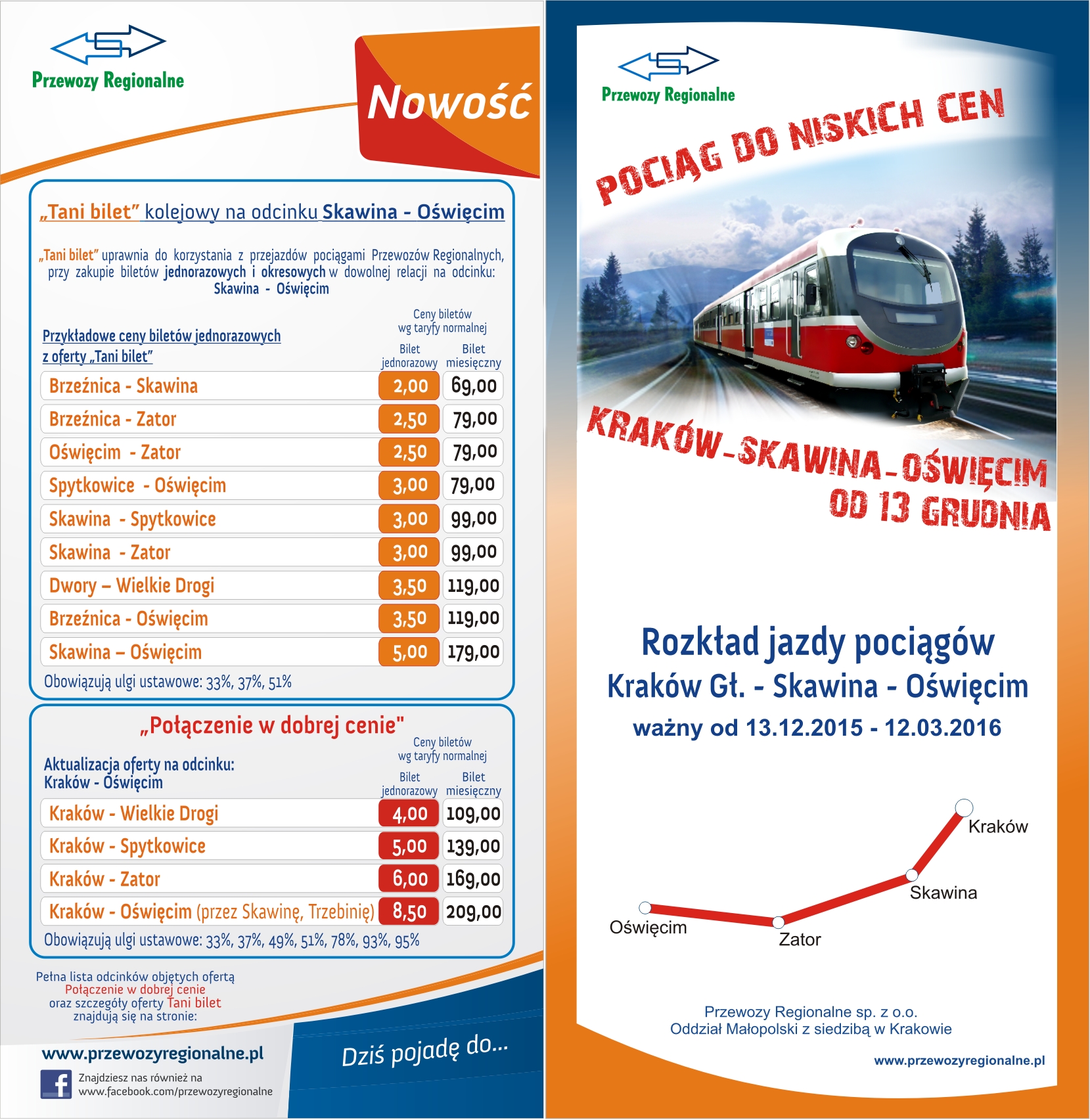 Dzięki wsparciu samorządów lokalnych ceny biletów na ten ekologiczny i wygodny środek transportu będą stosunkowo niskie (np. z Zatora do Oświęcimia 2,50 zł, z Zatora do Krakowa 6,00 zł). Aby zachęcić podróżnych do korzystania ze swoich usług Przewozy Regionalne tj. spółka obsługująca linię komunikacyjną wprowadza na odcinku Skawina — Oświęcim nową pozataryfową promocję „Tani Bilet" oraz dodatkową ofertę „Połączenie w Dobrej Cenie” (szczegóły w załączniku).