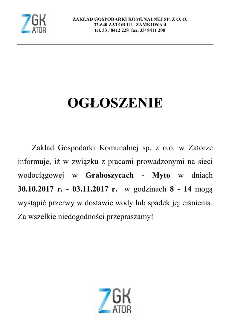 Ogłoszenie ZGK sp. z o.o. dot. przerwy w dostawie wody lub spadek jej ciśnienia w Graboszycach - Myto od 30.10. -03.11.2017 r. 2017-10-27