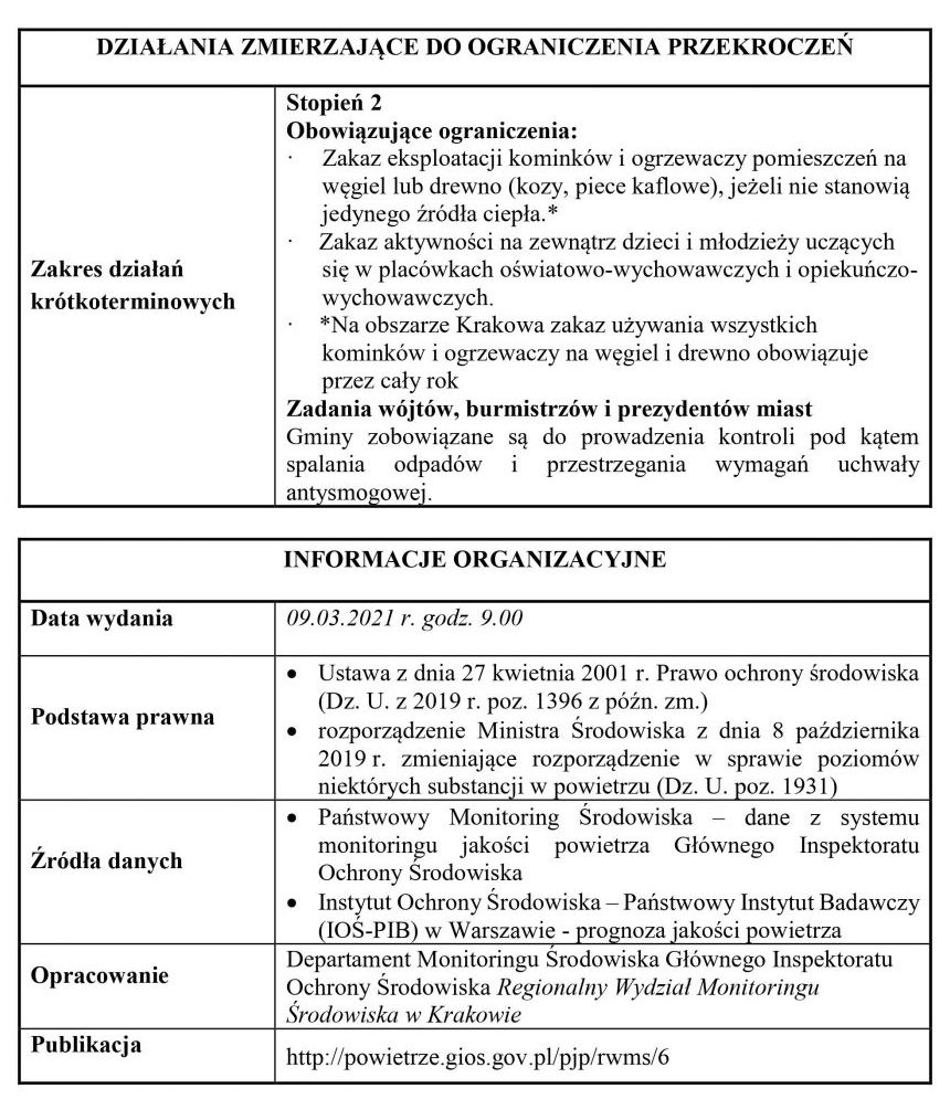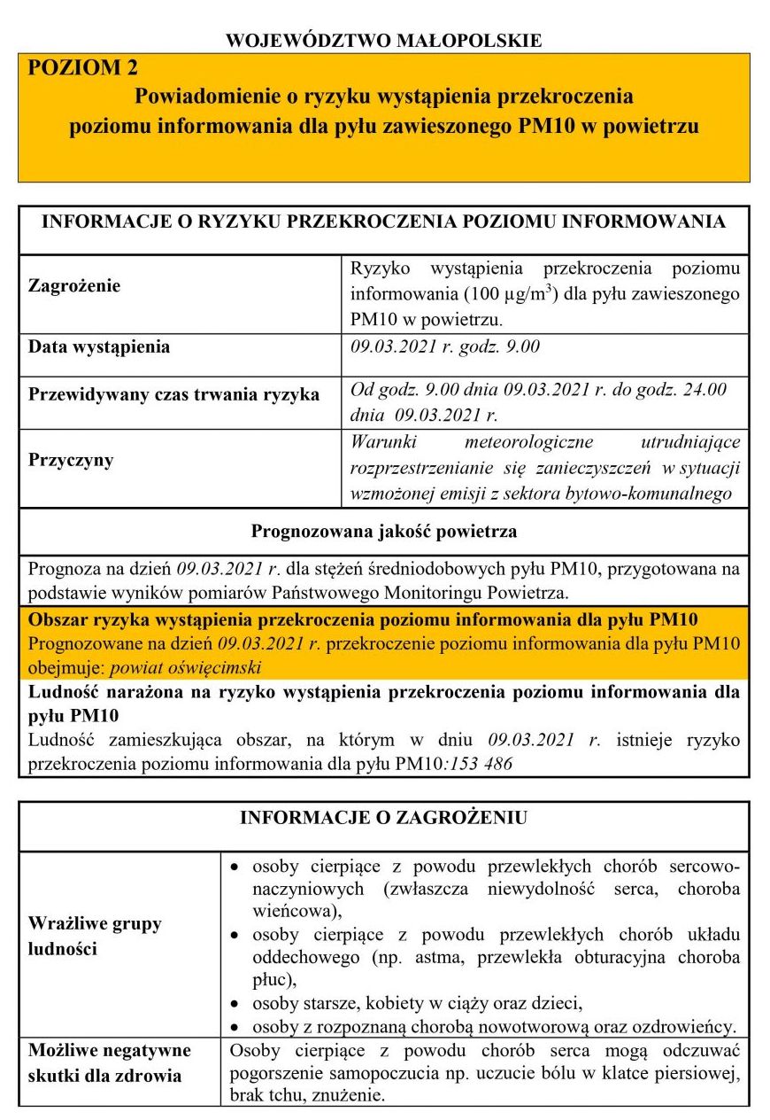 Ostrzeżenie II stopnia o zanieczyszczeniu powietrza pyłem PM10 dla powiatu oświęcimskiego 2021-03-09