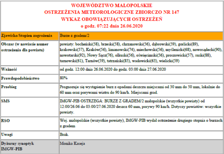 Ostrzeżenie meteorologiczne: Burze z gradem/2 2020-06-26