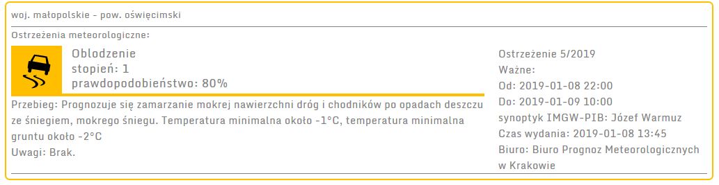 Ostrzeżenie meteorologiczne: Oblodzenie, stopień: 1 2019-01-08